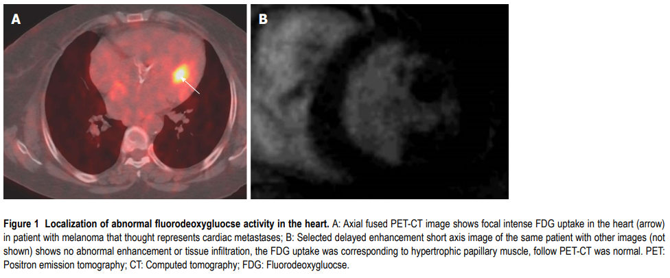 The FDG uptake is able to distinguish between benign and malignant tumors. Even with an appearance of normal anatomical variants, variable uptake of FDG needs to prompt cardiac MR, which is useful in elucidating the diagnosis.
